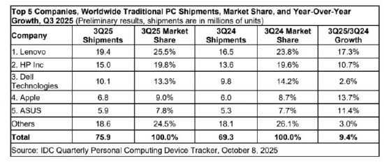 新浪科技讯 10月10日中午消息,根据国际数据公司(IDC)《全球季度个人计算设备追踪报告》发布的初步结果显示,2025年第三季度,全球传统个人电脑(包括台式机、笔记本电脑和工作站)市场出货总量达到7590万台,相较于去年同期(6930万台)增长了9.4%。